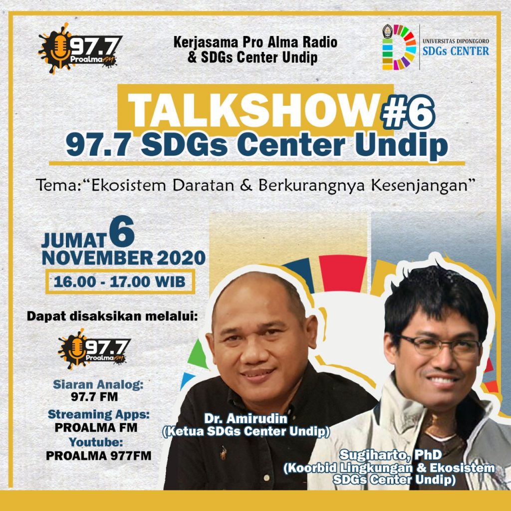 SDGS CENTER UNDIP, Jumat (6/11) kembali menggelar Talkshow kerjasama Radio Proalma 97.7 FM pukul 16.00-17.30 WIB. Talkshow ini merupakan perwujudan kepedulian agar SDGs lebih membumi (localized) dan terintegrasi ke dalam agenda-agenda strategis di kampus (manapun), agenda pembangunan lokal, regional, dan nasional. Tema talkshow keenam kali ini: Ekosistem Daratan (G15) dan Mengakhiri Kesenjangan (G10).