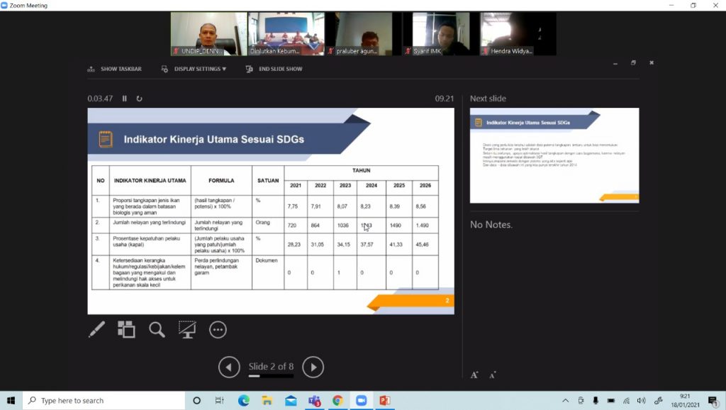 Dalam pertemuan ini, dipaparkan kondisi lautan dan perikanan pesisir Kabupaten Kebumen sampai tahun 2014 dan juga perkiraan produksi perikanan dan kondisi nelayan hingga tahun 2026. Prof. Denny Nugroho Sugianto sebagai narasumber menyampaikan masukan-masukannya terkait pengelolaan perikanan dan kelautan, serta arahan pelaksanaan SDGs dalam penyusunan Indikator Kinerja Utama Dinas Kelautan dan Perikanan Kabupaten Kebumen. Selain itu juga disampaikan data apa saja yang diperlukan sebagai bahan kajian potensi perikanan dan kelautan meliputi potensi perikanan budidaya baik dari segi lahan maupun teknologi, potensi unggulan perikanan di masing-masing wilayah dari hulu sampai hilir, data RTP budidaya per wilayah, data keluar masuk produk perikanan, dan kebutuhan konsumsi produk perikanan di Kabupaten Kebumen. Keterlibatan tim UNDIP dalam pertemuan ini sebagai wujud partisipasi aktif SDGs Center UNDIP dalam pewujudan SDGs (goal 12, 13, 14 dan 17).