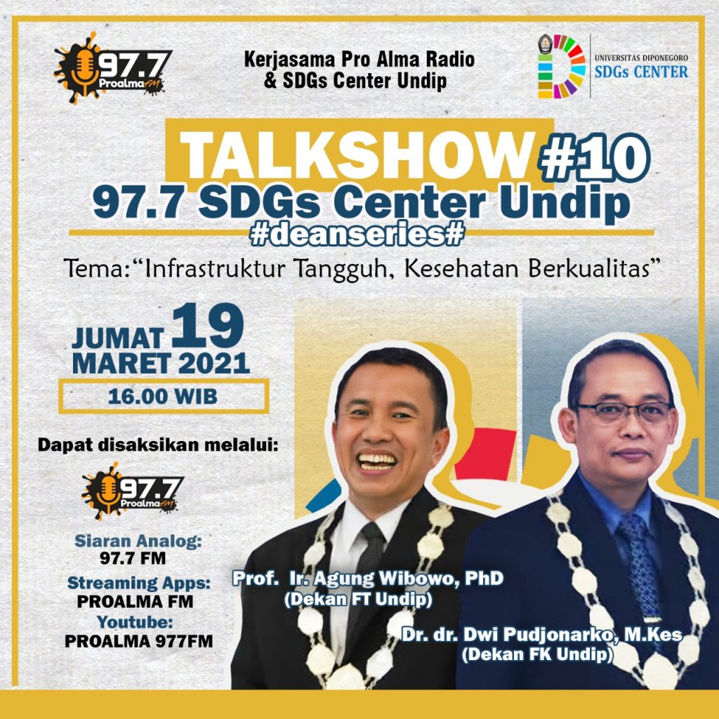 SDGs Center UNDIP menggelar kembali Talkshow SDGs #deanseries pada hari Jumat (19/03) bekerja sama dengan ProAlma Radio 977 FM. Tema bincang radio kali ini adalah Infrastruktur Tangguh (Goal 9) dan Kesehatan Berkualitas dan Kehidupan Sejahtera (Goal 3), dengan narasumber Prof. Ir. Agung Wibowo, Ph.D. (Dekan Fakultas Teknik) dan Dr. dr. Dwi Pudjonarko, M.Kes (Dekan Fakultas Kedokteran). Acara bincang radio ini dipandu oleh Ara Agatha selama lebih kurang satu jam.
