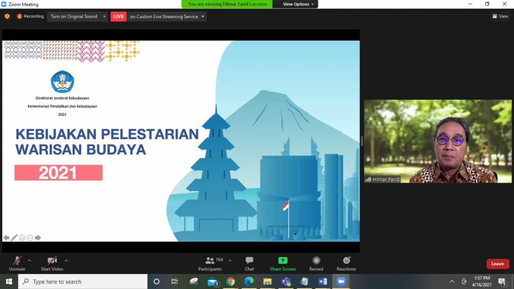 Narasumber pertama webinar ini yaitu Hilmar Farid, Ph.D (Dirjen Kebudayaan Kemendikbud RI). Beliau memaparkan 7 butir kebijakan pembangunan kebudayaan tahun 2020-2024 yang meliputi 1. Menyediakan ruang bagi keragaman ekspresi budaya dan mendorong interaksi untuk memperkuat kebudayaan yang inklusif; 2. Melindungi dan mengembangkan nilai, ekspresi dan praktik kebudayaan tradisional untuk memperkaya kebudayaan nasional; 3. Mengembangkan dan memanfaatkan kekayaan budaya untuk memperkuat kedudukan Indonesia di dunia internasional; 4. Memanfaaatkan objek pemajuan kebudayaan untuk meningkatkan kesejahteraan masyarakat; 5. Memajukan kebudayaan yang melindungi keanekaragaman hayati dan memperkuat ekosistem; 6. Reformasi kelembagaan dan penganggaran kebudayaan untuk mendukung agenda pemajuan kebudayan; 7. Meningkatkan peran pemerintah sebagai fasilitator pemajuan kebudayaan. Ketujuh kebijakan pembangunan kebudayaan ini menjadi landasan pelaksanaan 4 tugas negara negara dalam pembangunan kebudayaan: Pelindungan, Pengembangan, Pemanfaatan, Pembinaan. Tugas negara dalam pembangunan kebudayaan ini menghasilkan beberapa hasil kemajuan pembangunan kebudayaan yang bisa ditakar secara kuantitatif meliputi 7 dimensi indeks pembangunan kebudayaan (Dimensi Ekonomi Budaya, Pendidikan, Ketahanan Sosial-Budaya, Warisan Budaya, Ekspresi Budaya, Budaya Literasi, Kesetaraan Gender) dan 31 indikator.
