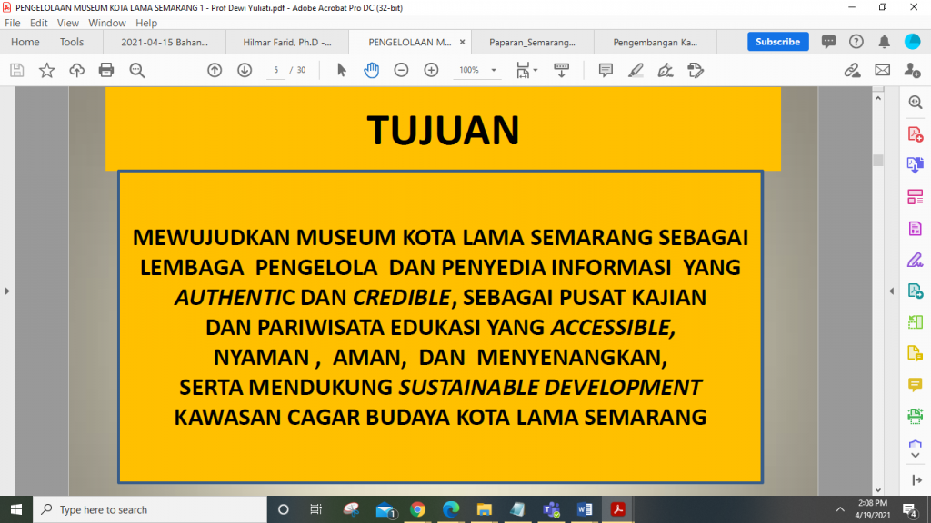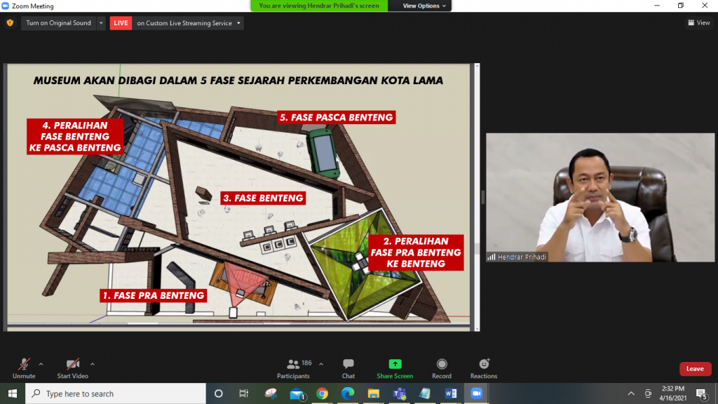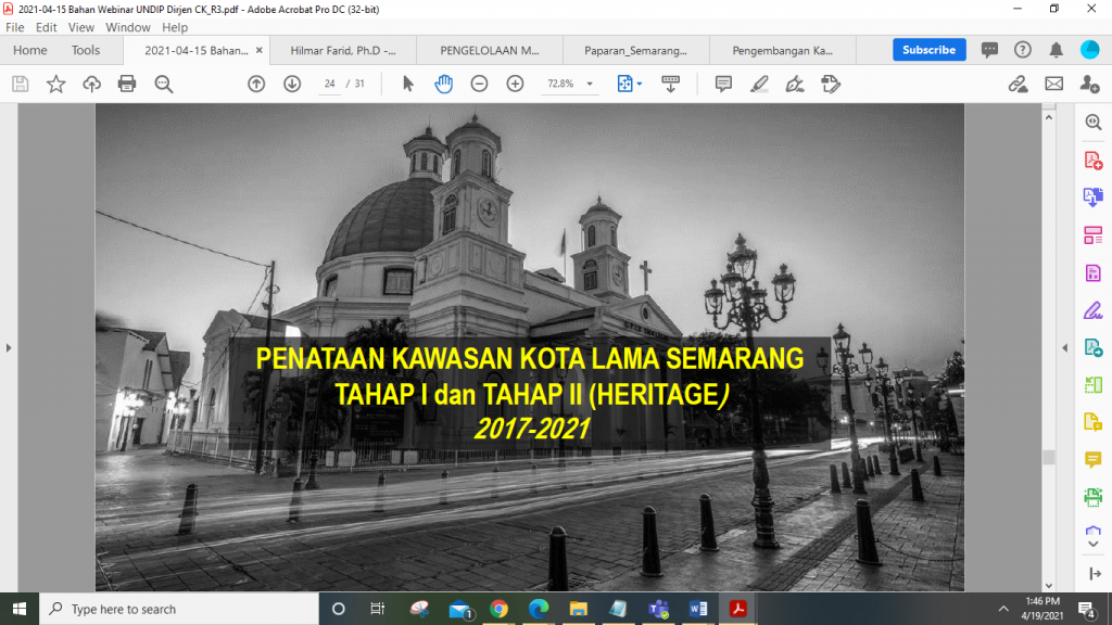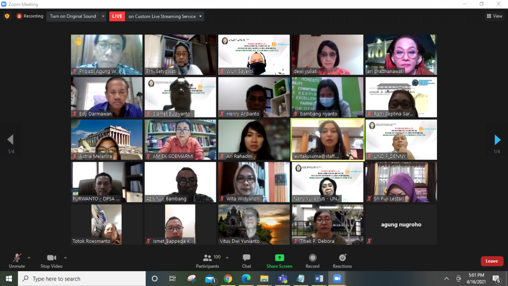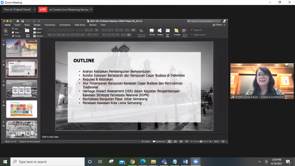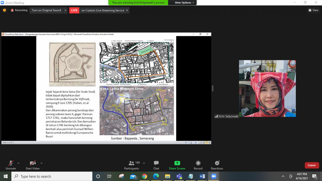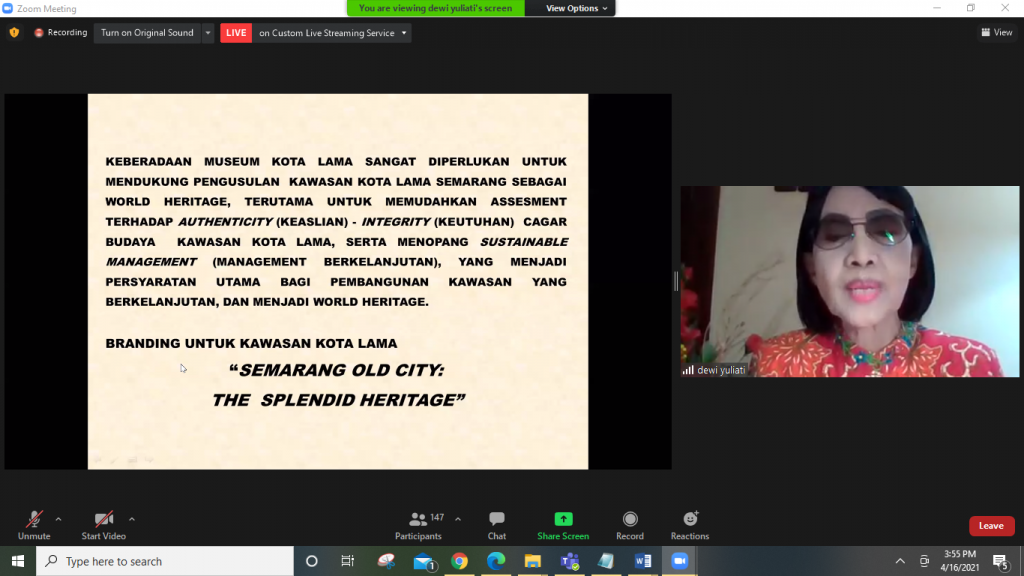 Pada Jumat, 16 April 2021, berlangsung webinar kedua yang diselenggarakan oleh Dewan Profesor Senat Akademik dengan mengambil tema “Pengembangan Museum dan Kawasan Kota Lama Semarang Berbasis Pembangunan Berkelanjutan”. Tema ini diangkat mengingat Kawasan Kota Lama Semarang merupakan kawasan yang signifikan untuk direvitalisasi agar terwujud tujuan kesebelas dalam Sustainable Development Goals (atau Tujuan Pembangunan Berkelanjutan) yaitu Kehidupan Kota dan Komunitas yang tumbuh dan berjalan secara berkelanjutan. Webinar berlangsung selama tiga setengah jam (pukul 13.30-17.00 WIB) melalui Zoom Meeting dipandu oleh Levita Kusuma sebagai pembawa acara dan dimoderatori oleh Prof. Dr. Ari Pradhanawati. Bertepatan dengan peringatan hari Kartini, webinar ini menghadirkan para peneliti wanita terbaik, Srikandi Guru Besar UNDIP, yang mempunyai pengalaman cukup banyak dalam pengembangan Museum dan Kawasan Kota Lama Semarang berbasis pembangunan berkelanjutan; dan tiga narasumber lain yang membahas seluk beluk Pengembangan Kota Lama dan Pembangunan Museum Kota Lama.