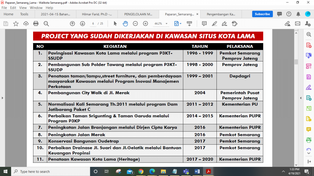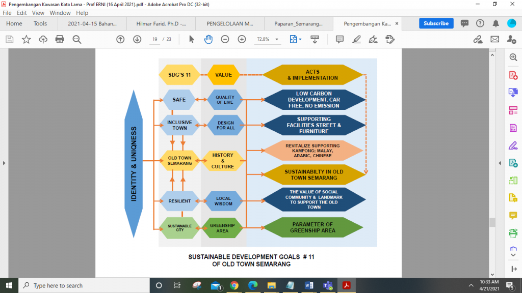 Berikutnya Prof. Erni memaparkan tentang keterkaitan antara pentingnya revitalisasi dan pengembangan Kawasan Kota Lama Semarang dengan pencapaian SDGs goal kesebelas mengenai Pembangunan Kota dan Kehidupan Masyarakat secara berkelanjutan. Poin-poin utama dari SDGs kesebelas adalah mewujudkan kota yang inklusif, aman, berkembang secara berkelanjutan, dengan komunitas yang memiliki daya lenting yang tinggi (inclusive town, resilient community, sustainable, and save city). Beliau juga menyebutkan untuk usaha menjadikan KKLS sebagai World Heritage City (Kota Pusaka Dunia) juga harus bisa menonjolkan identitas dan keunikan KKLS yang layak menjadi ciri khas World Heritage City. Usaha untuk menjadikan KKLS memerlukan kerja bersama dan kontribusi para pemangku kepentingan yang tergabung dan terkoordinasi dalam Komite Nasional Indonesia untuk UNESCO. Selain itu, gerakan komunitas lokal sekitar cagar budaya KKLS juga perlu digiatkan, agar pelibatan komunitas turut mendukung revitalisasi cagar budaya. Menurut Prof. Erni, ada enam kategori variabel pengembangan Kawasan Kota Semarang sebagai World Heritage City, antara lain: 1) Kandungan Sejarah yang kental, 2) Arah Kebijakan Pemerintah yang jelas dalam menata pengembangan wilayah, 3) Posisi Kawasan Kota Lama dalam Struktur Ruang Kota yang komprehensif, 4) Perawatan (maintenance) KKLS yang menjadikan kawasan tersebut selalu bersih, rapi dan nyaman untuk dikunjungi, 5) Adanya penampilan identitas para pemangku kepentingan yang terlibat dalam revitalisasi dan pengembangan KKLS pada fasilitas-fasilitas umum yang bisa dikoordinasi oleh Pemerintah Kota agar seragam, 6) Tertampaknya konsep sustainability pada KKLS. Materi Prof. Dr. Erni Setyowati bisa diunduh di sini.