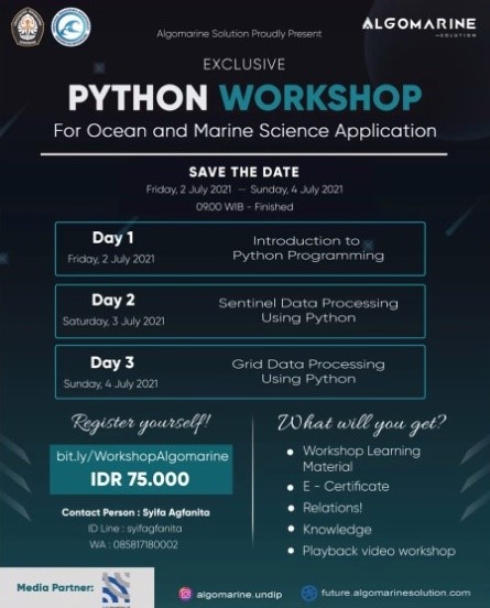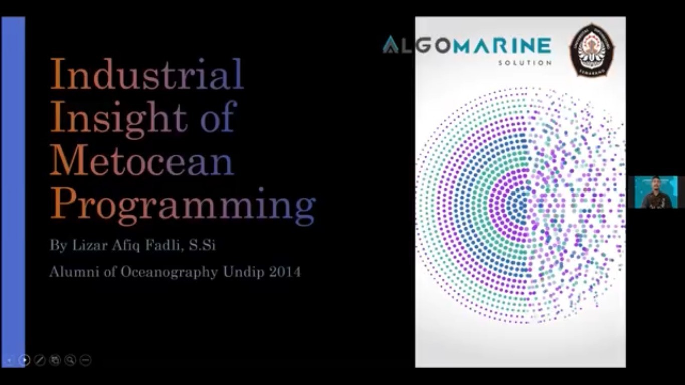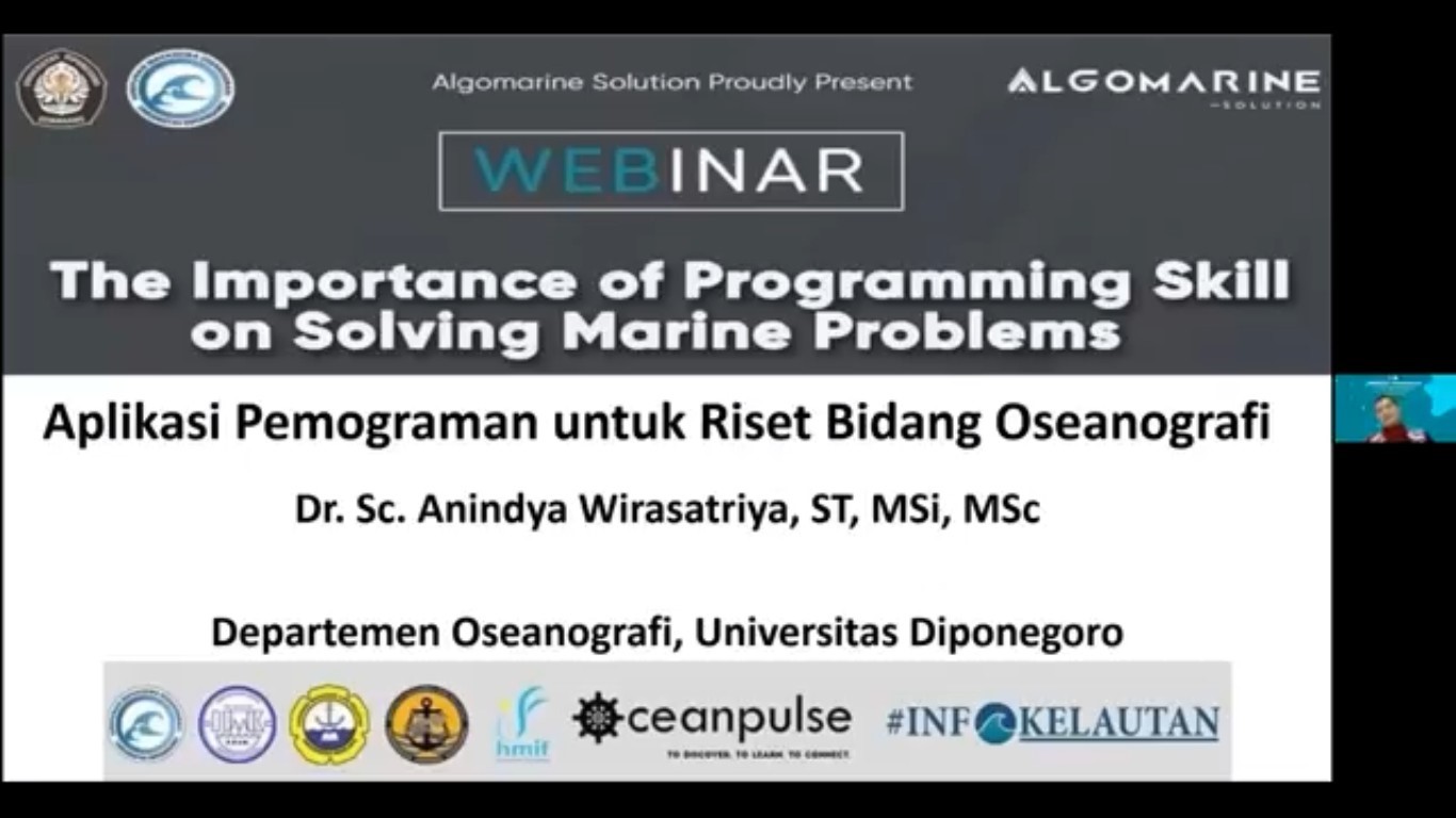 Perkembangan teknologi serta bahasa pemrograman dalam proses pengolahan dan analisis data dewasa ini semakin pesat. Hal ini kemudian yang menjadi salah satu latar belakang dilaksanakannya acara Webinar “The Importance of Programming Skill on Solving Marine Problems” yang diinisiasikan oleh Komunitas Algomarine Undip Departemen Oseanografi. Webinar ini telah dilaksanakan pada Sabtu (26/6/21) dengan menghadirkan pembicara yang mumpuni di bidangnya yaitu: Dr. Sc. Anindya Wirasatriya, S.T., M.Si., M.Sc, Dinda Mazeda, S.Kel, dan Lizar Afiq Fadil, S.Si.