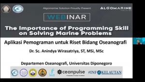 Webinar ini juga turut dihadiri oleh rekan-rekan civitas akademika Departemen Oseanografi Undip, juga peserta yang berasal dari berbagai perguruan tinggi dan instansi. Penyampaian materi pertama diawali oleh Bapak Dr. Sc. Anindya Wirasatriya, S.T., M.Si., M.Sc dengan judul: “Aplikasi Pemrograman untuk Riset Bidang Oseanografi”. Materi yang disampaikan membuka perspektif baru dalam penuntasan masalah bidang oseanografi dengan pengaplikasian bahasa pemrograman. Selain itu, disampaikan pula potensi-potensi penelitian atau riset yang dapat dikembangkan oleh mahasiswa ataupun akademisi di bidang oseanografi, yang kemudian dapat mengaplikasikan bahasa pemrograman dalam proses pengolahan serta analisis data.