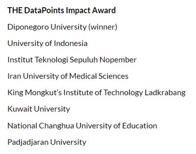Adapun beberapa universitas di Asia yang masuk ke dalam nominasi THE Datapoints Impact Award 2022 diantaranya adalah Diponegoro University, University of Indonesia, Institut Teknologi Sepuluh Nopember, Iran University of Medical Sciences, King Mongkut’s Institute of Technology Ladkrabang, Kuwait University, National Changhua University of Education, Padjadjaran University. Dari beberapa nominator tersebut, Universitas Diponegoro memperoleh peringkat ke-1 (https://theawardsasia.com/2022/en/page/winners). Hal ini menjadi pembuktian bahwa Undip merupakan salah satu perguruan tinggi terbaik di Asia dalam implementasi pencapaian SDGs serta merupakan salah satu Universitas terkemuka di Asia yang menaruh perhatian besar terhadap upaya mengatasi dampak perubahan iklim, termasuk implementasi efisiensi dan keberlanjutan energi. President APAC THE World Universities Insights Simone Dilena, menyampaikan langsung bahwa Universitas Diponegoro merupakan salah satu universitas terkemuka di Asia yang memberi perhatian penuh pada upaya mengatasi perubahan iklim pada acara THE Asia Universities Summit 2022 di Fujita Health University, Toyoake, Japan tanggal 31 Mei 2022.