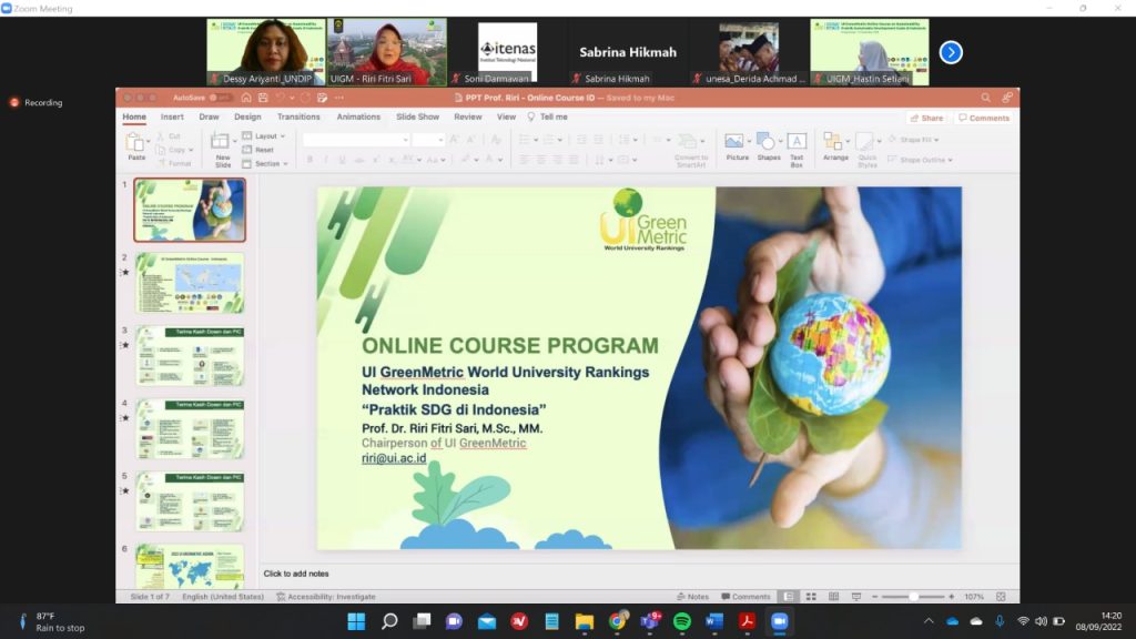 This online course was officially opened on Thursday, September 8, 2022 via a zoom meeting at 2-5 p.m. Western Indonesia Standard Time. The opening of the online course began with remarks from Prof. Dr. Ir. Riri Fitri Sari as Chair of UI Greenmetric. Prof Riri said that having a determination of achieving common goal to learn about SDGs best practices and immediately putting them into practice to create a better Indonesian economy in the future will help us and strengthen our steps to reach the top six in the world economy in 2045. The next speech was by the National Coordinator of the UI Greenmetric World University Ranking Network (UIGWURN), Prof. Dr. Ir. Ambariyanto, M.Sc who is also the Vice Rector for Research Innovation and Collaboration of Universitas Diponegoro. In his speech, Prof. Ambariyanto stated that this online course activity has been endeavored to be carried out as well as possible to provide experiences of studying outside their own study program for students. Prof. Ambariyanto also mentioned that the presence of the SDGs make us move together to achieve common goals, so that students who take this online course are able to play an active role in implementing the SDGs and be able to expand their networks.