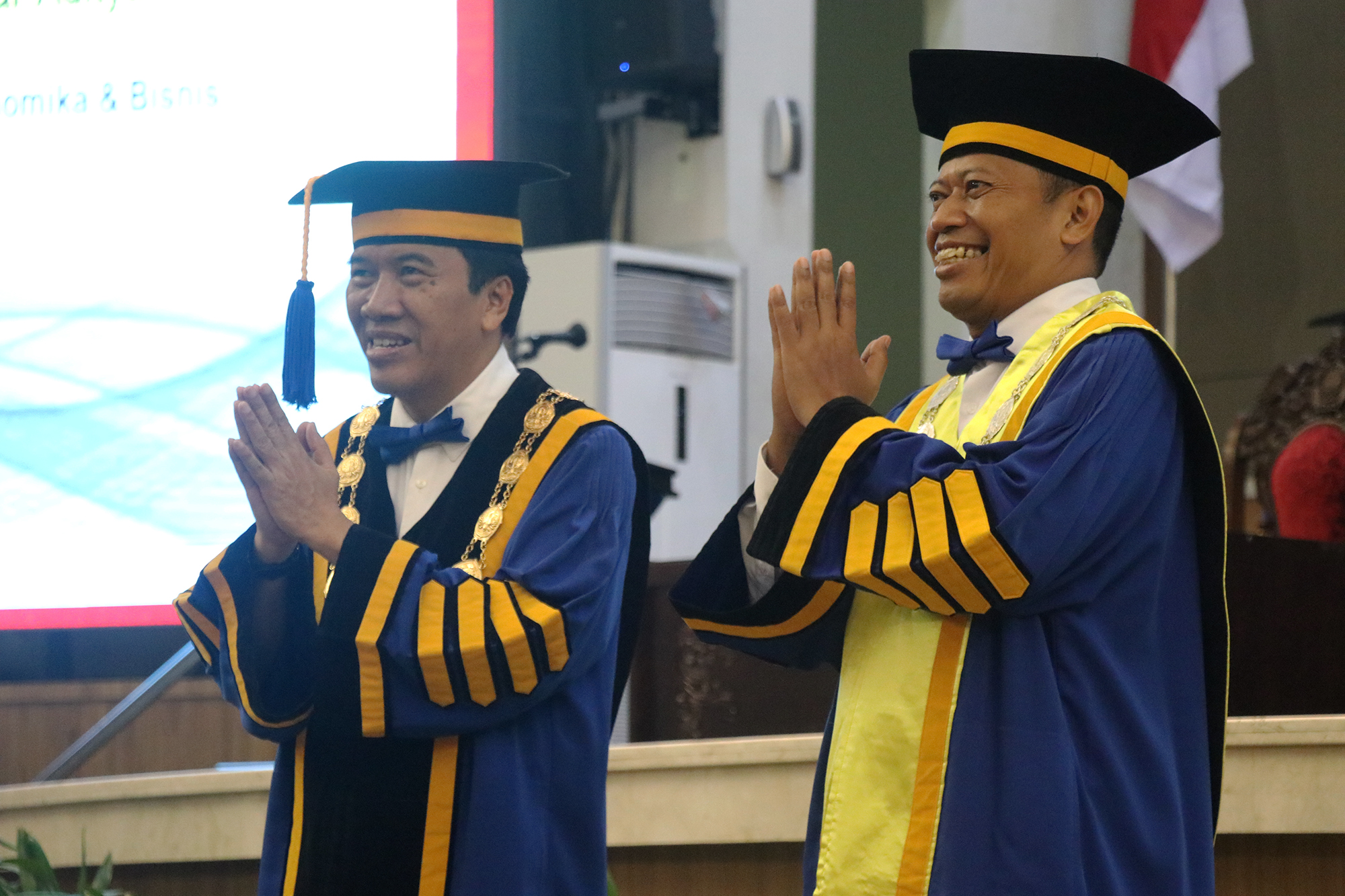 Rektor Undip Prof. Dr. Yos Johan Utama S.H., M.Hum. (kiri) bersama dengan Dekan Fakultas Ekonomika dan Bisnis Prof. Dr. Suharnomo, S.E., M.Si. (kanan) saat memberi selamat kepada wisudawan Undip.
