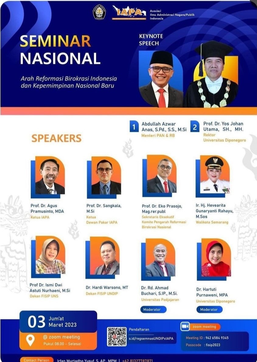 Menyikapi hal tersebut FISIP Undip bekerjasama dengan Indonesian Association for Public Administration (IAPA) akan menyelenggarakan Seminar Nasional dengan Tema Arah Reformasi Birokrasi Indonesia dan Kepemimpinan Nasional Baru. Menurut Ketua Panitia, Amni Zarkasyi Rahman, S.A.P., M.Si., acara yang akan diselenggarakan pada Jumat (3/3) tersebut akan menghadirkan banyak pembicara nasional yang akan membahas roadmap reformasi birokrasi hingga berbagai dinamikanya. Kegiatan ini tidak terbatas pada pelaksanaan seminar nasional saja, namun juga akan menjadi pijakan awal dalam penyusunan Buku Putih (white book) Arah Birokrasi Indonesia di Kepemimpinan Nasional yang nantinya akan disampaikan oleh IAPA kepada para calon presiden dan wakil presiden RI mendatang. Kegiatan ini juga disertai dengan pelantikan Dewan Pinpinan Pusat (DPP) IAPA.