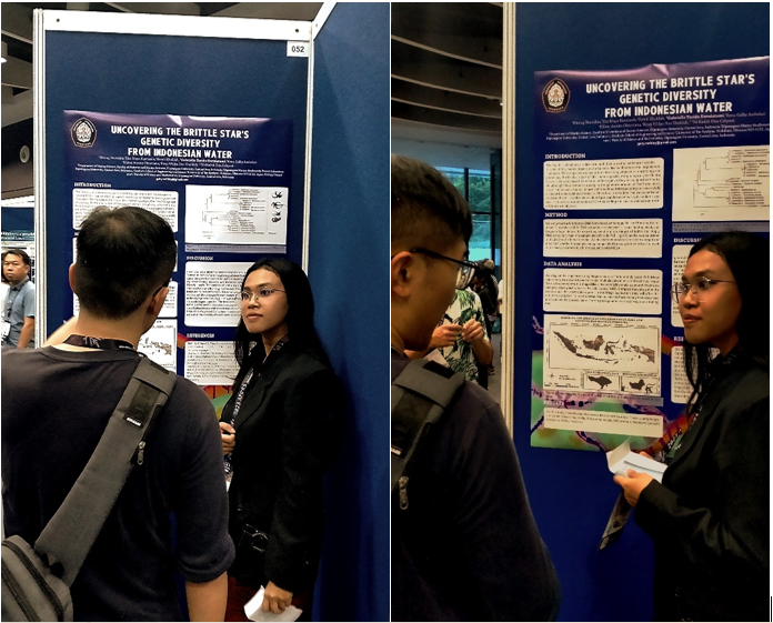 Poster yang dibawakan oleh Gabriella mengambil judul “Uncovering the Brittle star’s Genetic Diversity from Indonesian Water”. Penelitian ini mengupas keragaman genetik dari beberapa spesies bintang mengular dengan pendekatan molekuler (DNA Barcoding). Poster ini merupakan hasil penelitian dosen Biologi, FSM, UNDIP, Ni Kadek Dita Cahyani dan melibatkan tiga orang mahasiswa biologi lainnya, Rena Galby Andadari dan Hilmy Anissa Octaviana dari program IUP dan Rizqi Widya Nur Kholifah dari program regular.