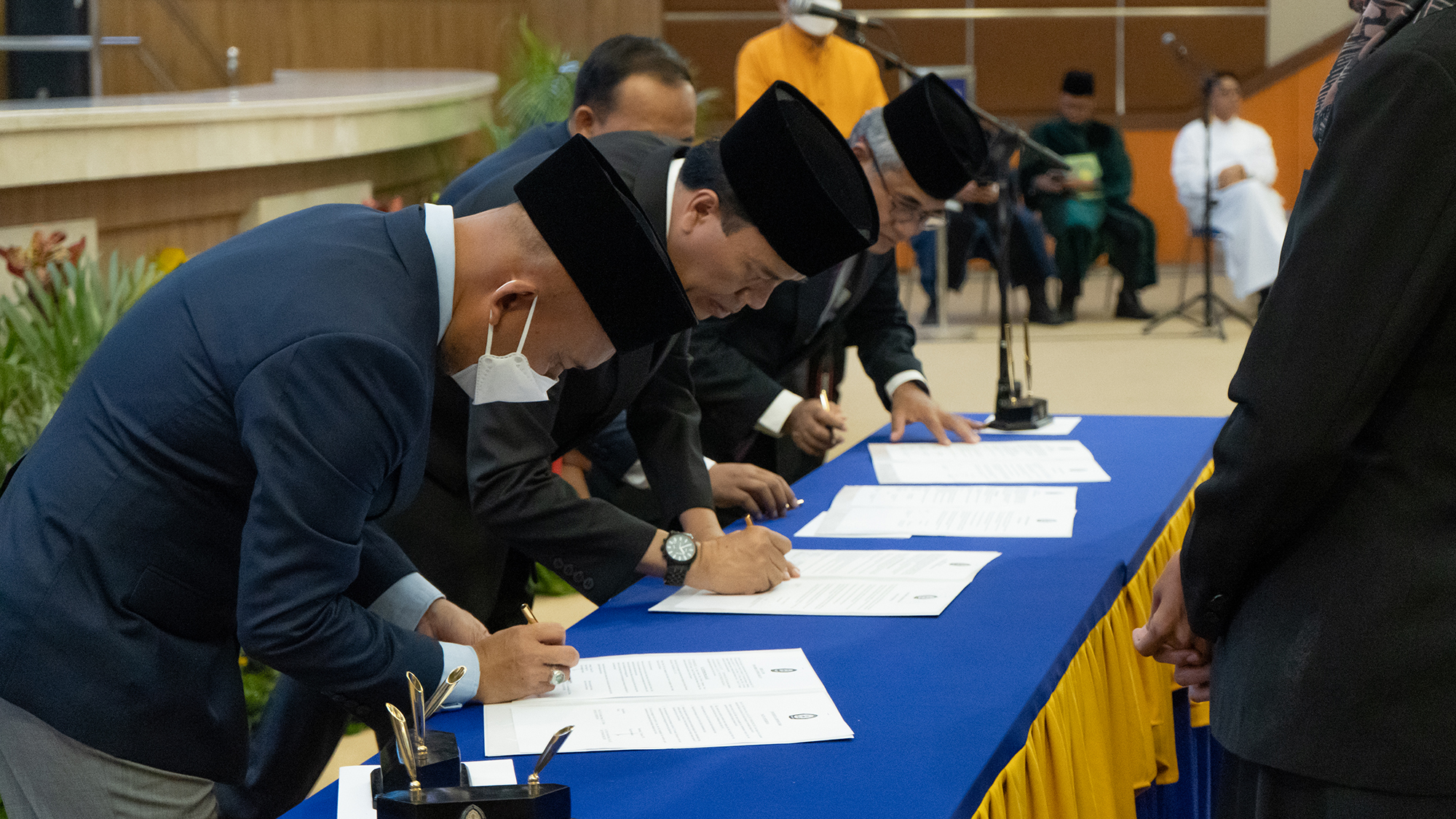 Pengambilan sumpah jabatan dilakukan oleh Rektor Undip didampingi rohaniawan sesuai dengan kepercayaan masing-masing pejabat. Selanjutnya Penandatanganan Berita Acara Sumpah Pegawai oleh Rektor Undip beserta Prof. Dr. rer. nat. Heru Susanto, S.T., M.M., M.T. dan Prof. Ir. Edy Rianto, M.Sc., Ph.D., IPU. sebagai saksi.